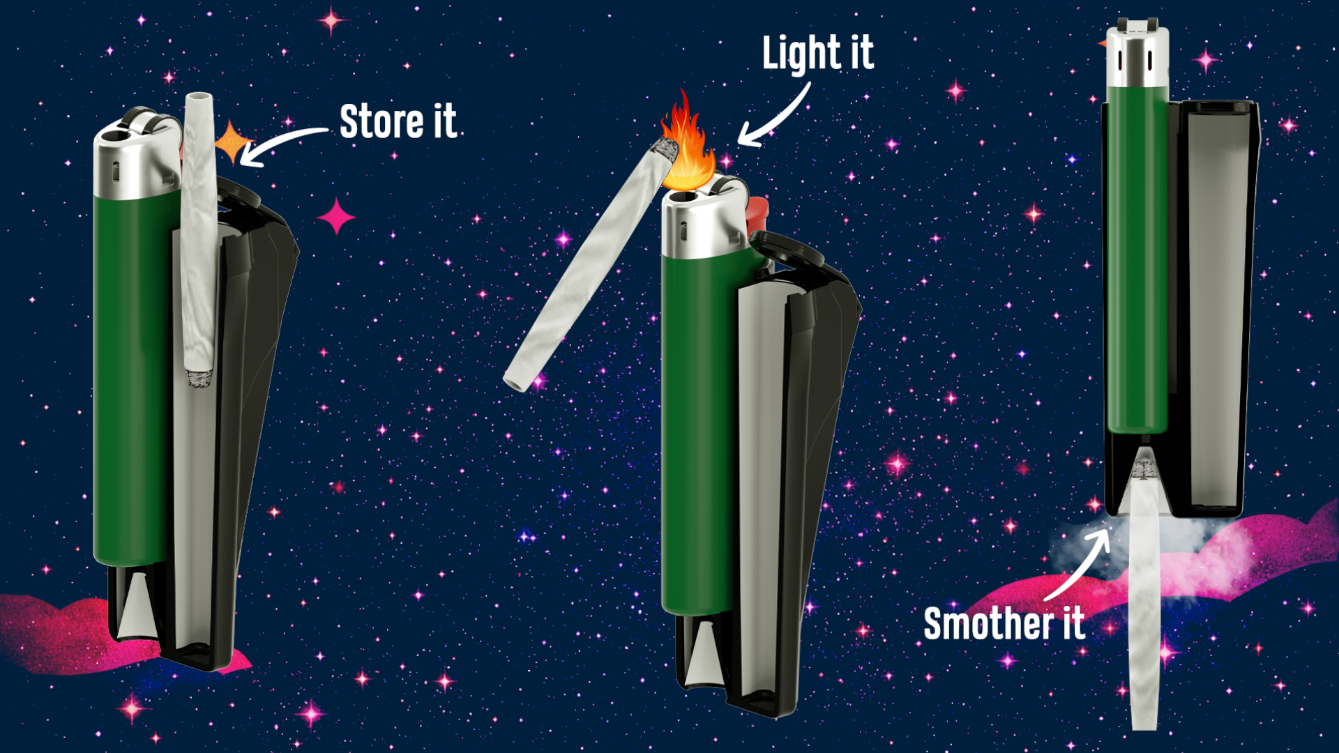 The modern lighter case designed for anyone who wants a cleaner, simpler smoke session. One quick click and the joint is completely out—no ash, no lingering smoke, no burn marks on your furniture or clothes.